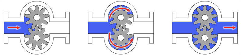 External gear pumps are the simplest and most common type of rotary gear pump. They typically have two gears on separate shafts with one shaft connected to a motor. The unmeshing of the gears creates a vacuum on the inlet of the pump. When the gears are turned, fluid is trapped between the gear teeth and the cavity wall of the casing. It is then rotated to the outlet and discharged. Fluid cannot flow backward to the inlet because of the gear mesh and thus must discharge out the outlet. The pumped fluid lubricates the gear mesh and associated journal bearings.
