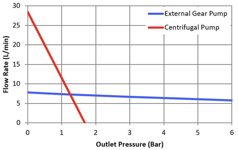 The behavior of positive displacement pumps is considerably different than centrifugal pumps, which rely on the momentum of the accelerated fluid to deliver flow at pressure and are very sensitive to pressure changes. The graph on the right compares an external gear pump (common positive displacement pump) and centrifugal pump using the same size motor. While centrifugal pumps can reach considerably higher flow rates, they are extremely sensitive to pressure.