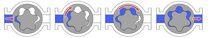 Rotary positive displacement pumps use a series of rotating volumes to transfer fluids rather than the linear motion of reciprocating pumps. The rotating elements seal against the pump casing or against other rotating elements. Typically, there are multiple volumes per revolution, leading to a much smoother flow than reciprocating pumps. However, the volumes are typically not as precise as reciprocating pumps, which make them less suited for metering or dispensing applications. The most common types of rotary positive displacement pumps are: