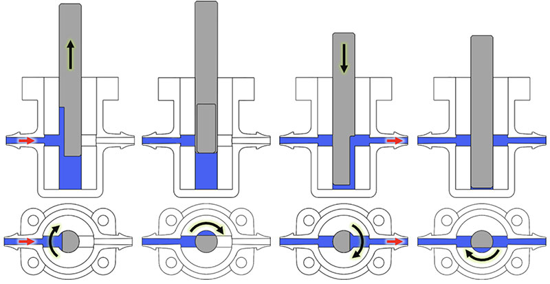 This specialty version of the piston pump is valveless and is sometimes referred to as a valveless metering pump. The pumps have a sinusoidal linear motion coupled with 360° rotation of the piston. The piston has a flat on the end that opens/closes the inlet and outlet ports synchronized with piston motion. This type of pump eliminates valves, which can wear and stick, and greatly simplifies the overall design.