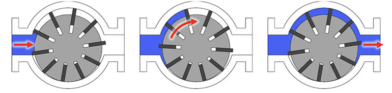 Vane pumps have only one rotating element that is eccentric to the pump cavity. The rotating element contains multiple vanes that can slide or deform to fit the profile of the cavity wall. The vanes form a tight sliding seal against the cavity wall, trapping the volume of fluid on the inlet and discharging it to the outlet. Vane pumps are very insensitive to pressure changes because the vanes contact the cavity wall. However, sliding between the vanes and wall creates power, noise, and lifetime issues.